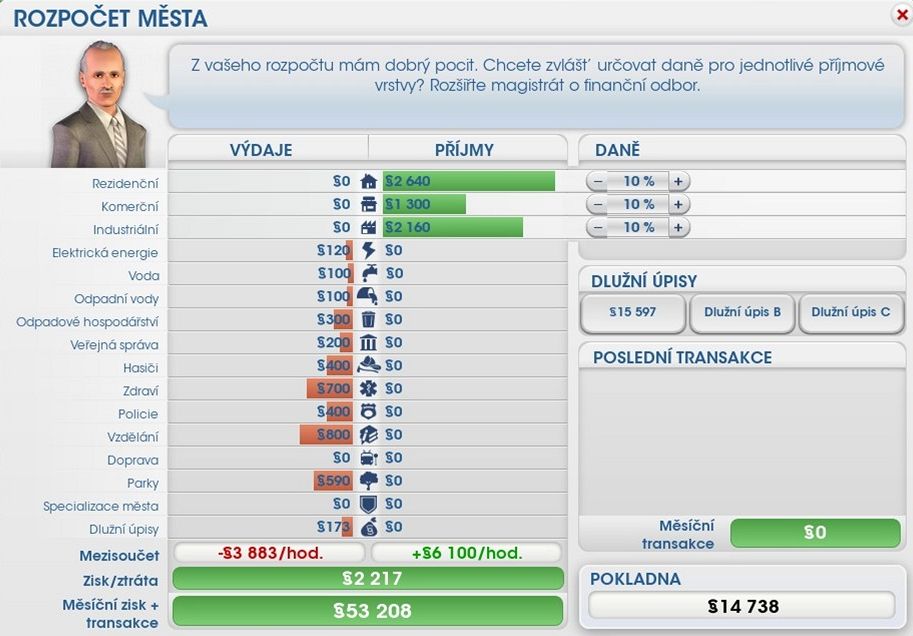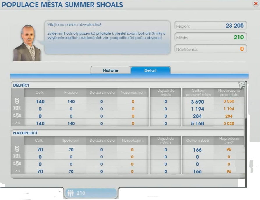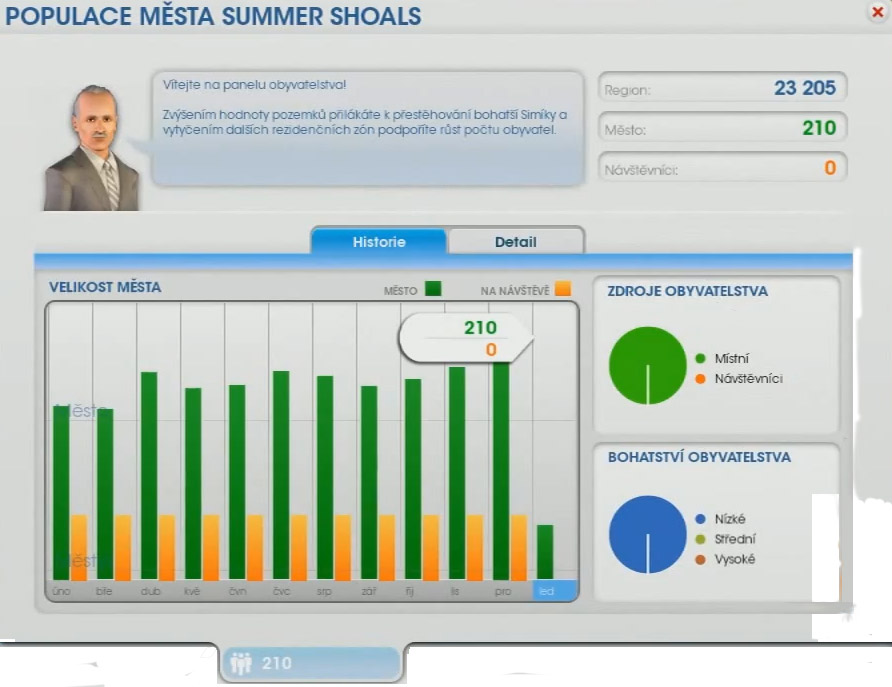 Na tomto panelu můžete sledovat vývoj růstu města a celkového bohatství.
